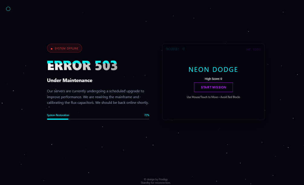 Transform your boring "Site Under Maintenance" or "503 Service Unavailable" screen into an engaging experience. This project is a robust, single-file HTML/CSS/JS template designed to retain user attention during downtime. It features a stunning Cyberpunk/Sci-Fi UI and a fully functional arcade browser game ("Neon Dodge").